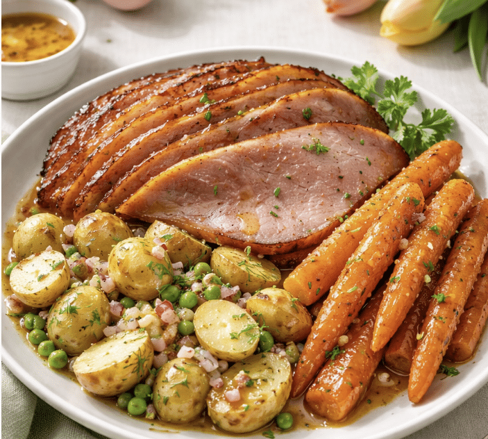 Spiral-cut ham (honey glaze), carrots, honey, olive oil or avocado oil, potatoes, red onion, fresh herbs, vinaigrette (olive oil, vinegar, mustard, spices), sea salt, black pepper.